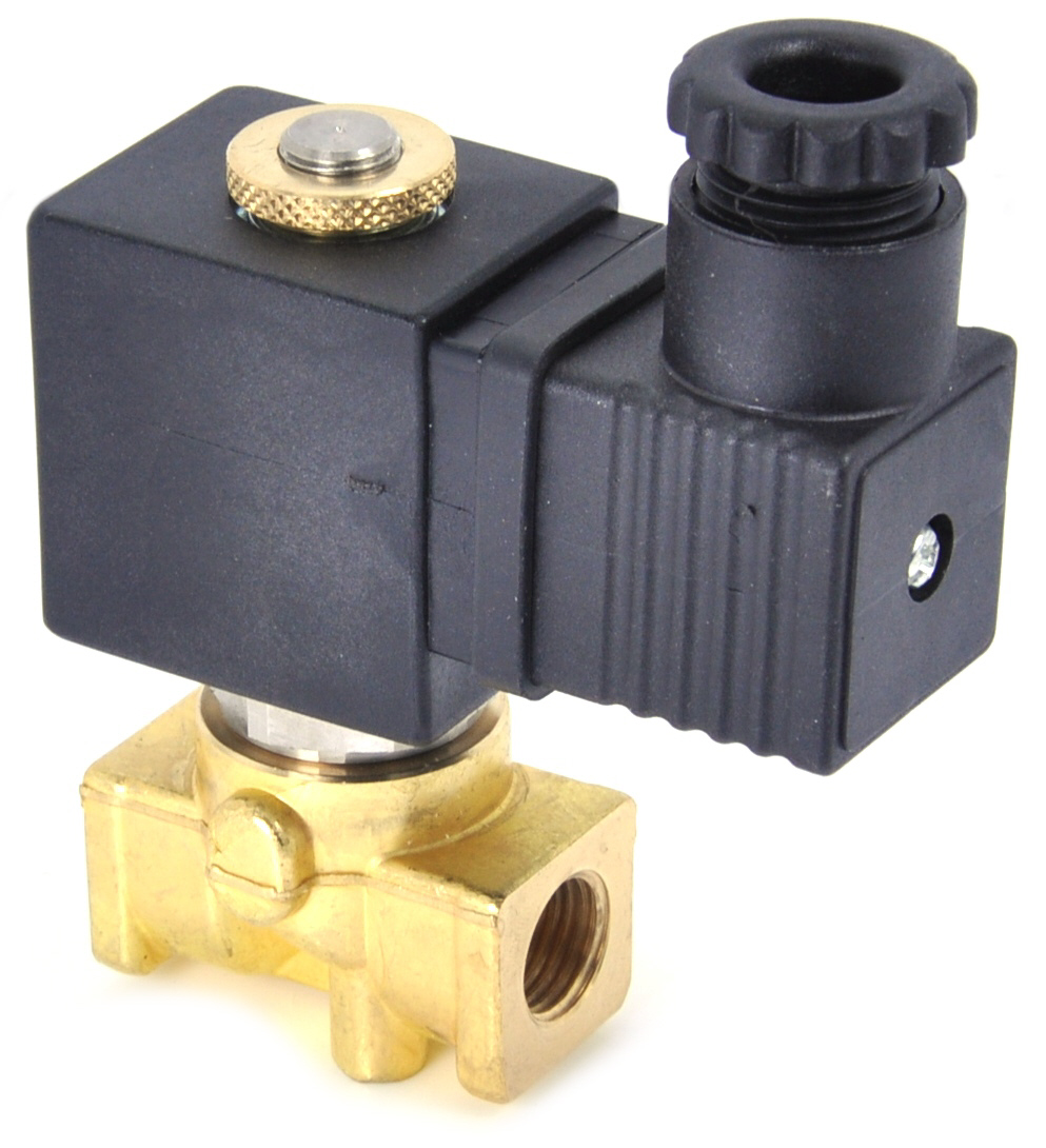 1/4" BSP Solenoid Valve. Two Way Normally Closed. Direct Acting. Brass Body. Stainless Steel Orifice 4.8mm. Niploy Plated Armature. EPDM Seals (-10 to +90C). Operating pressure range: 0-1.8 Bar. Kv7.2. C3 series solenoid coil 24VDC 8W. DIN 43650-A electrical socket connector