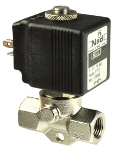 Solenoid Valve 1/4"BSP Two Way Normally Closed. Direct Acting. Cryogenic service. 316 stainless steel body, stainless steel internal moving parts. 2.0mm internal orifice. Operating pressure range: 0-10bar. PTFE seals (-196C). B7 series DIN solenoid coil 12VDC 21W. DIN 43650-A electrical socket connector