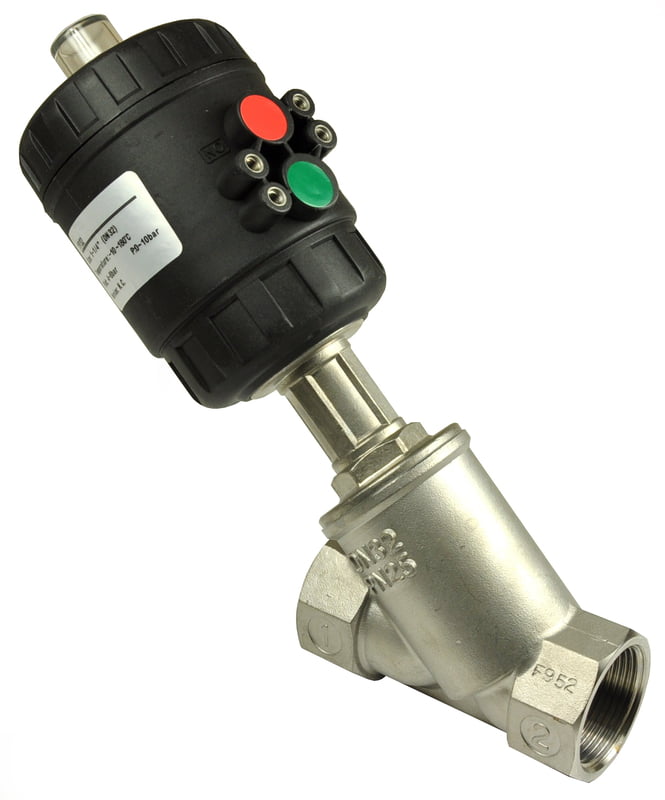 Pneumatic Angle Seat Piston Valve. 1 1/4"BSP Two Way Normally Closed. 316 stainless steel body. PTFE seals. (-10°C to +180°C ). NAMUR or nipple mount for the control valve. Differential pressure range: 0-10bar. Kv 315. Gaseous and liquid media compatible with seal and body materials