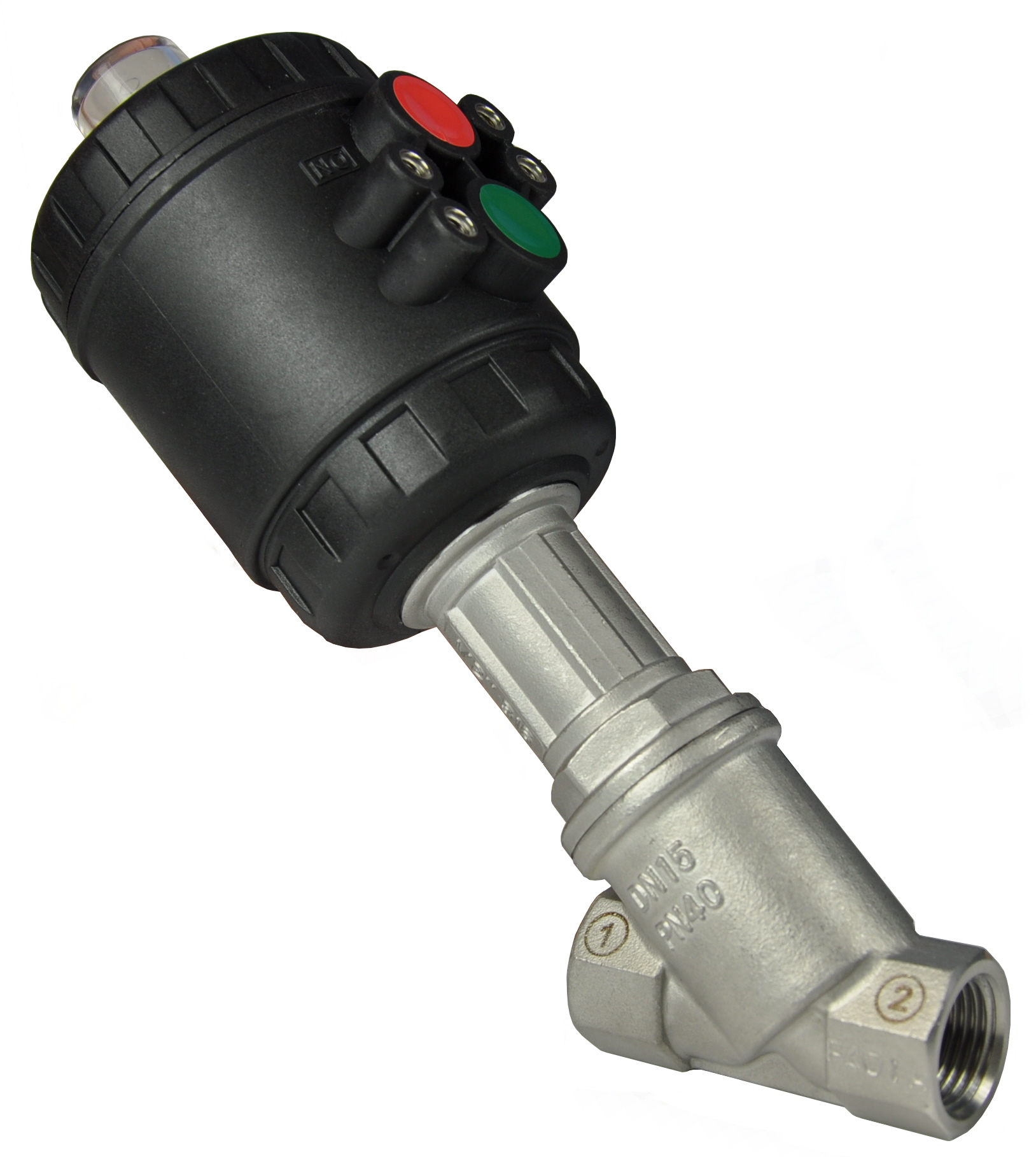 Pneumatic Angle Seat Piston Valve. 1"BSP Two Way Normally Closed. 316 stainless steel body. PTFE seals. (-10°C to +180°C ). NAMUR or nipple mount for the control valve. Differential pressure range: 0-10bar. Kv 186. Gaseous and liquid media compatible with seal and body materials