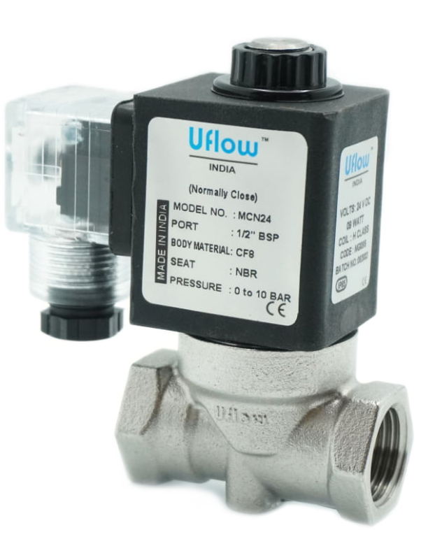 Solenoid Valve 1/2"BSP Two Way Normally Closed, Direct Acting. 316 Stainless Steel Body, stainless steel internal moving parts. Orifice 17mm. Pressure range: 0-8bar (DC). NBR seals: -30 to +90C. MGI09S Solenoid Coil: 24VDC 9W. DIN LED 43650-A electrical socket connector