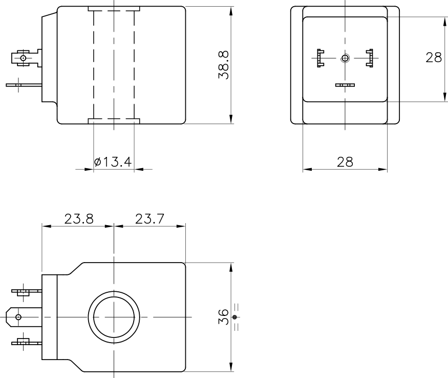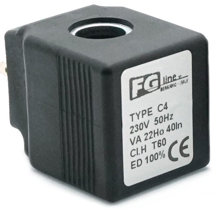Series C4 solenoid valve coil. Manufacturer: FG Line. 230VAC 40/22VA DIN 43650-A