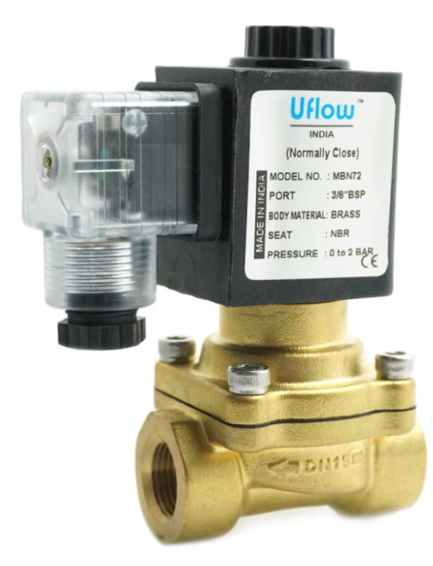 Solenoid valve 3/8" BSP Two Way Normally Closed, Assisted Lift Diaphragm. Brass body, stainless steel internal moving parts. 15.5mm orifice. Operating pressure: 0-2bar. NBR seals: -30C to +90C. Coil type: MG09S. 24VDC 9W. DIN LED 43650-A electrical socket connector