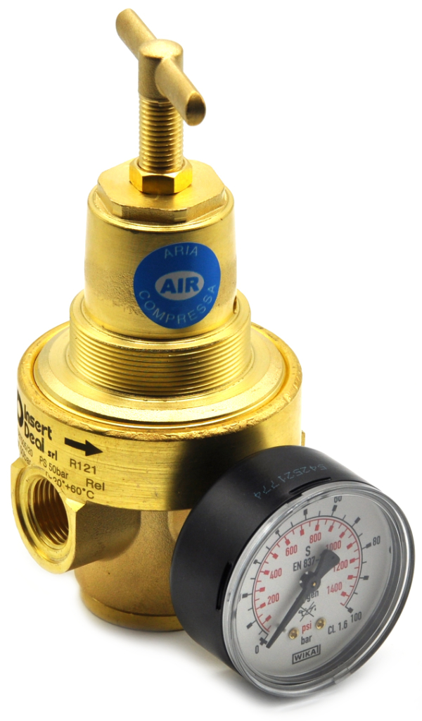 Manufacturer: Insert Deal. R121 brass pressure regulator, relieving type, G1/2" connections, max inlet pressure 50bar, outlet pressure range 5-50bar, NBR seals for compressed air duty only. With 100bar pressure gauge.