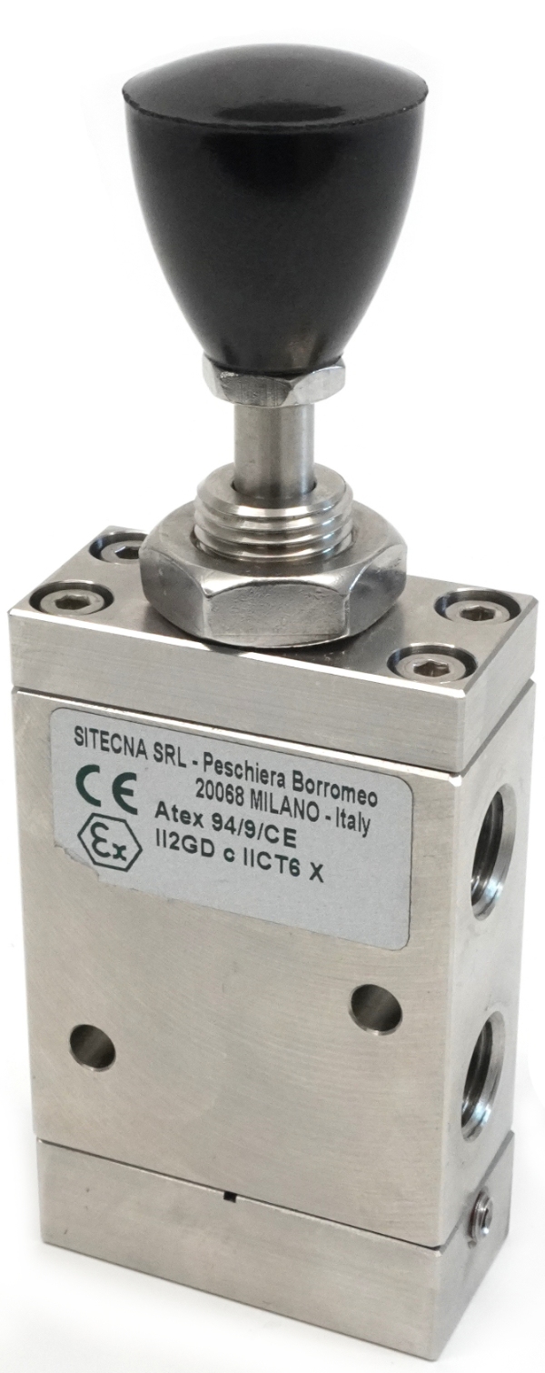 316L stainless steel 3/2 spool valve, manual push/pull detented, 1/4"NPT, working pressure -0.9-10bar, temp range -20 +80degC, ATEX II2GD c IICT6 X