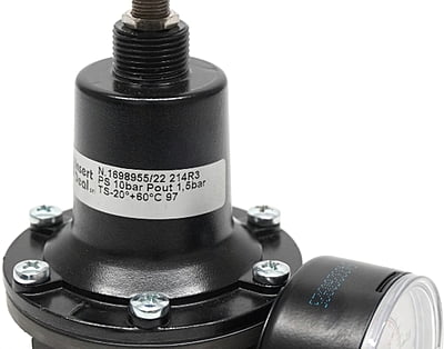 G1/4" aluminium non-relieving pressure regulator for air, max inlet pressure 10bar, outlet pressure range 20mbar... 1.5bar, NBR O-rings, pressure gauge