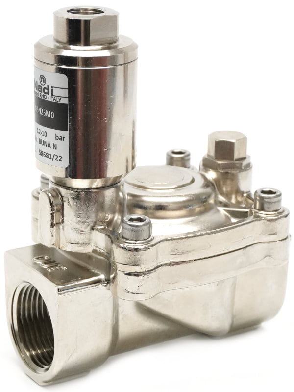 1" NPT Pneumatic Valve. Normally Closed. Servo Assisted Diaphragm. Niploy Plated Brass Body. Niploy Plated Brass Pneumatic Pilot. Orifice 25mm. NBR Seals (-10 to +70C). Operating Pressure range: 0.2-12 Bar. Kv 170