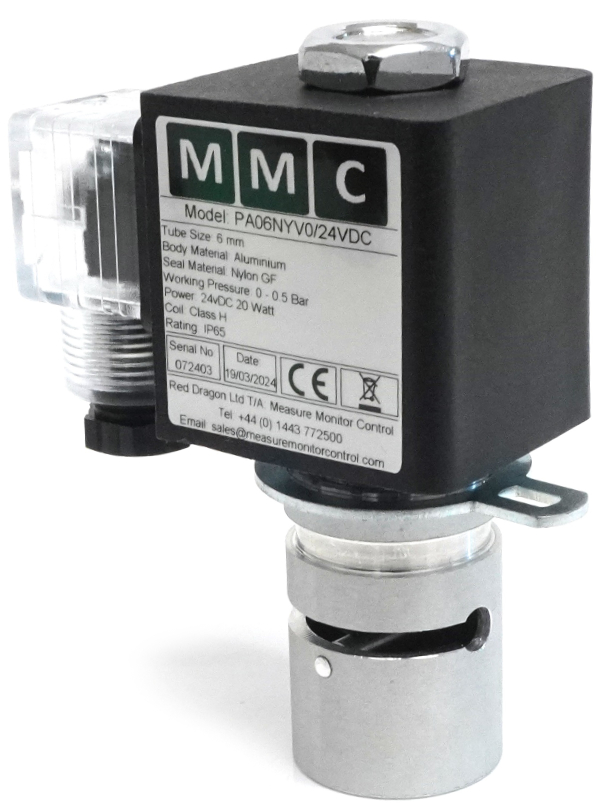 Pinch Valve. Two Way Normally Closed. Aluminium Body. Manual Override. Tubing OD: 6.0mm. 16mm solenoid coil diameter (DC). 24VDC 20W. DIN 43650-A LED electrical socket connector