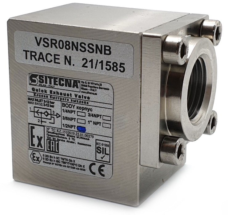 1/2"NPT quick exhaust valve 316LSS, pressure range 2-12bar, temp range -20 +80degC, ATEX II2GD c IICT6 X. Cv = 4.3 in and 6.9 out