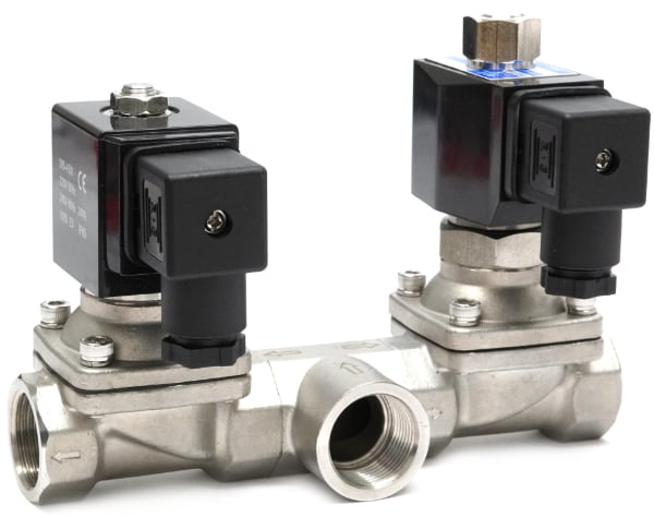 3/4" BSP 3/2 Commutative solenoid valve. Suitable for liquid and gaseous media, compatible with the seals and body materials. 304 stainless steel body. EPDM seals. 0-6bar. B Type: 1 inlet and 1 outlet, port 1 inlet, port 2 Normally Open, port 3 outlet