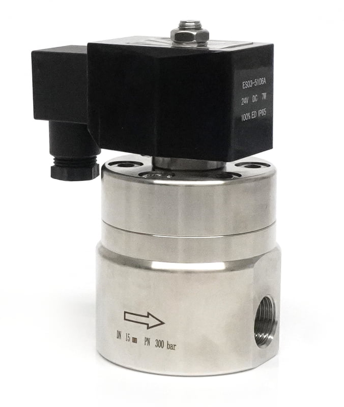 Solenoid Valve Super High Pressure. 1/2"BSP Two Way Normally Closed. Pilot Piston. 304 Stainless Steel body. Internal orifice: 15mm. Cv 4.7. PEEK seals. Operating pressure range: 6-300bar. ES ES03-510 A/B Series Energy Saving Solenoid Coil 24VDC 50/8W. DIN 43650-A electrical socket connector