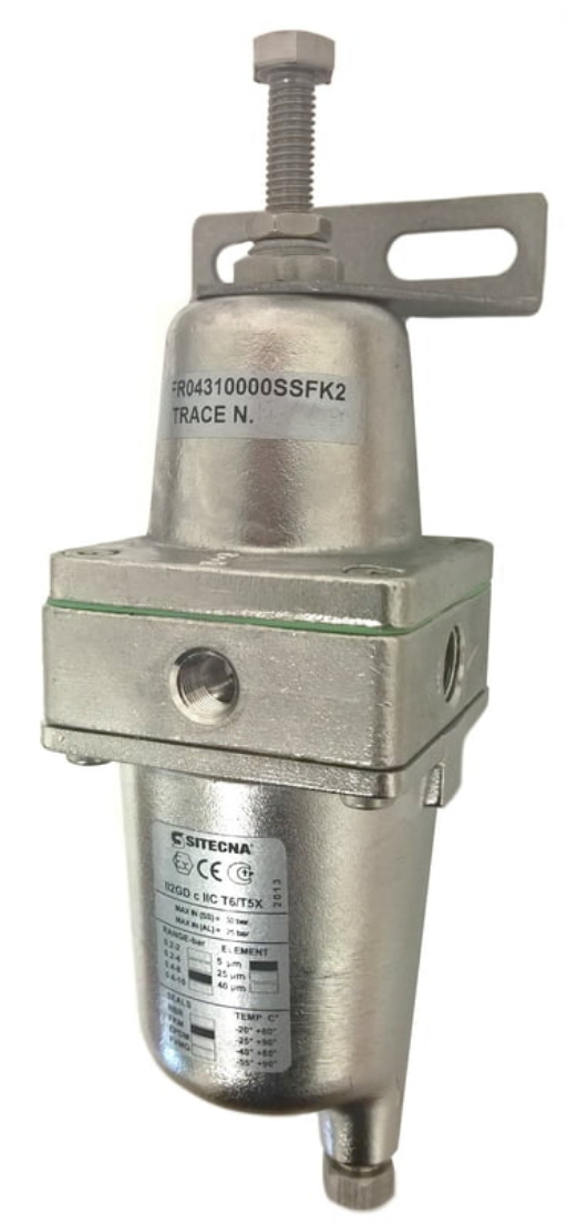 Sitecna 316L stainless steel filter regulator, relieving type, 1/4"NPT, 0.4-8bar, max inlet 30bar, 5 micron element, manual drain, temp range -20 +80degC, NBR seals, 1/8"NPT gauge ports, mounting bracket. ATEX II2GD c IICT6 X