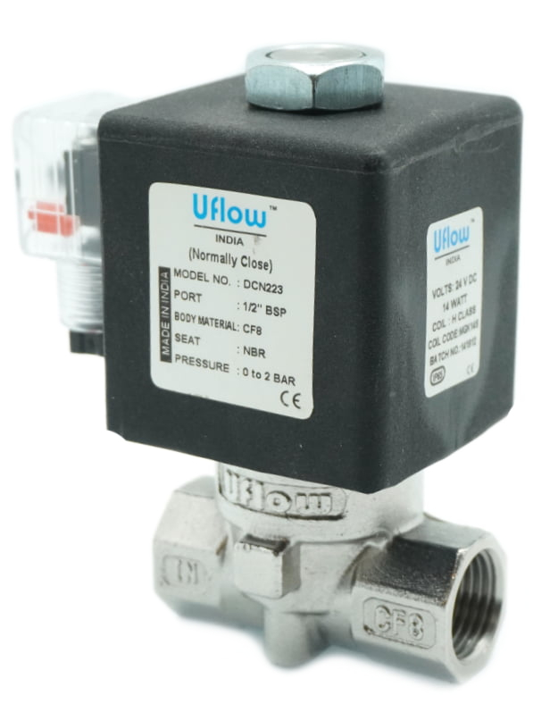 Port Size : 1/2" BSP. Body Material : CF8 (SS304). Pressure Range : 0 Bar to 2 Bar. Diaphragm : NBR (Nitrile). Orifice : 12.00mm. Media Temperature : -30 °C to 90 °C. Operating Voltage : 24VDC. Power Consumption : 15W. Media : Water, Air, Gas. Features : Epoxy Square Coil with LED Din Connector